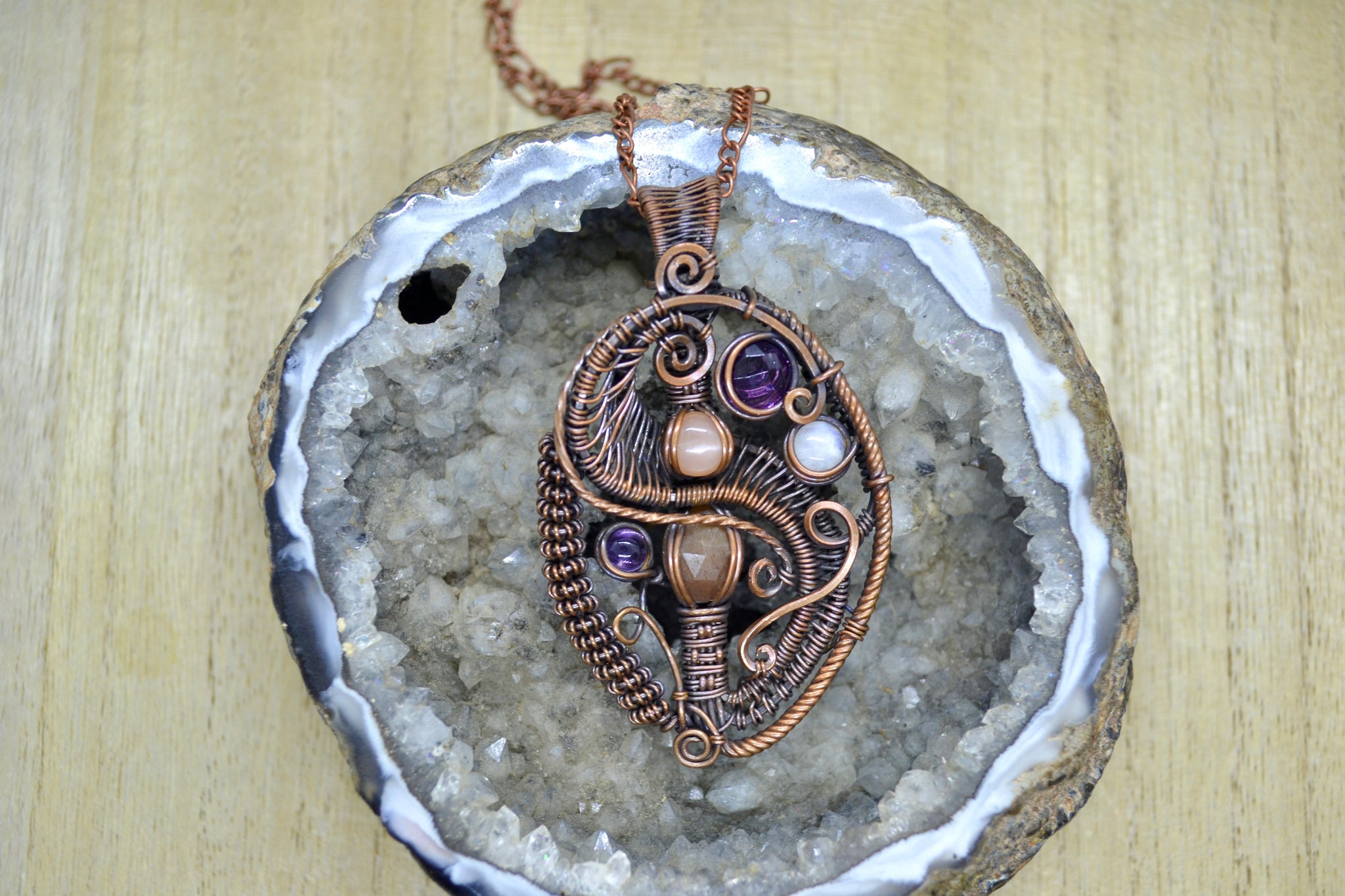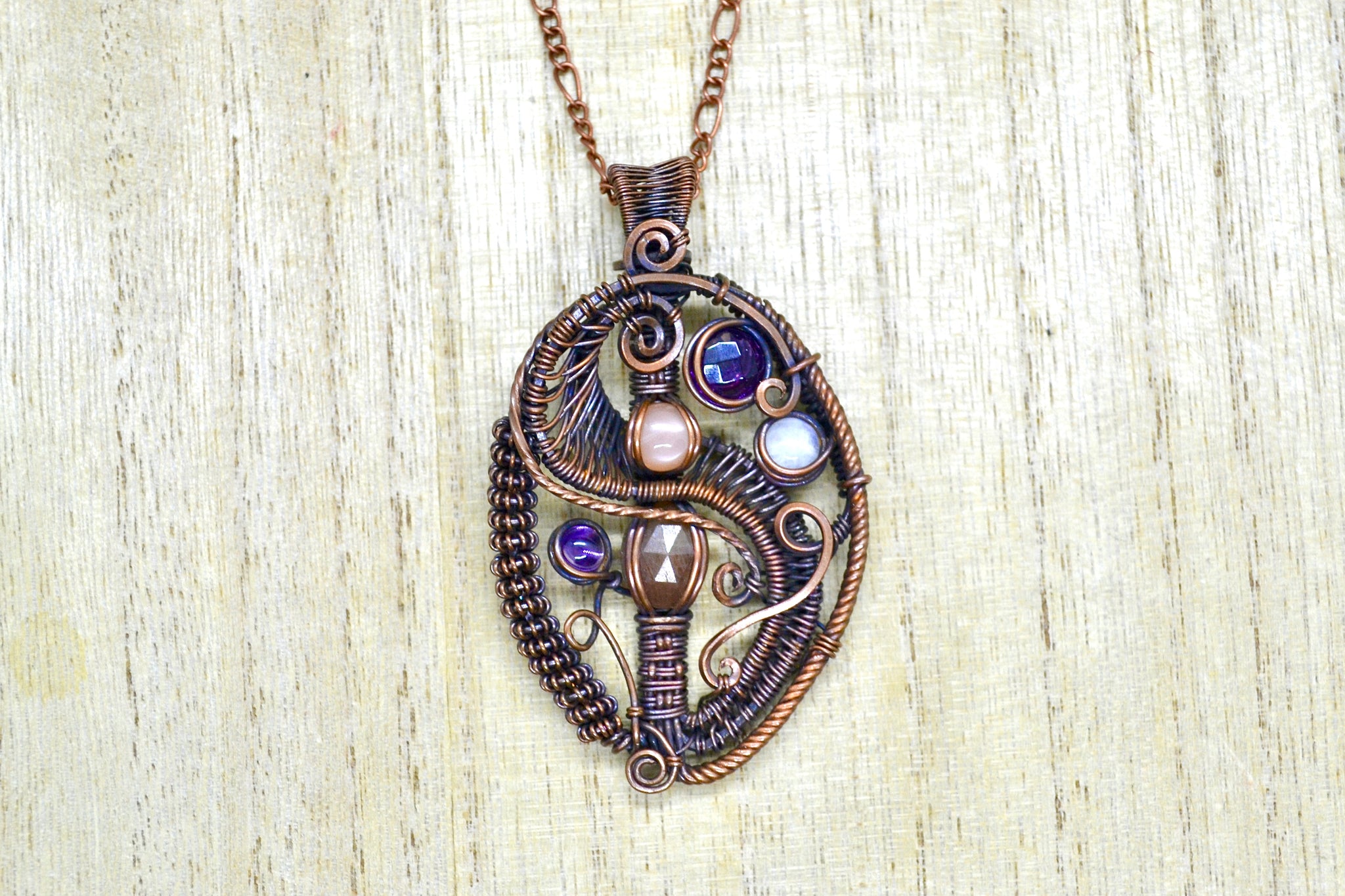 Each stone is hand-set within an elaborate framework of oxidized copper, wrapped with a variety of weaves and spirals that bring a sense of flow and quiet rhythm. It’s a pendant full of balance and contrast— light and shadow, softness and structure, shimmer and stillness.