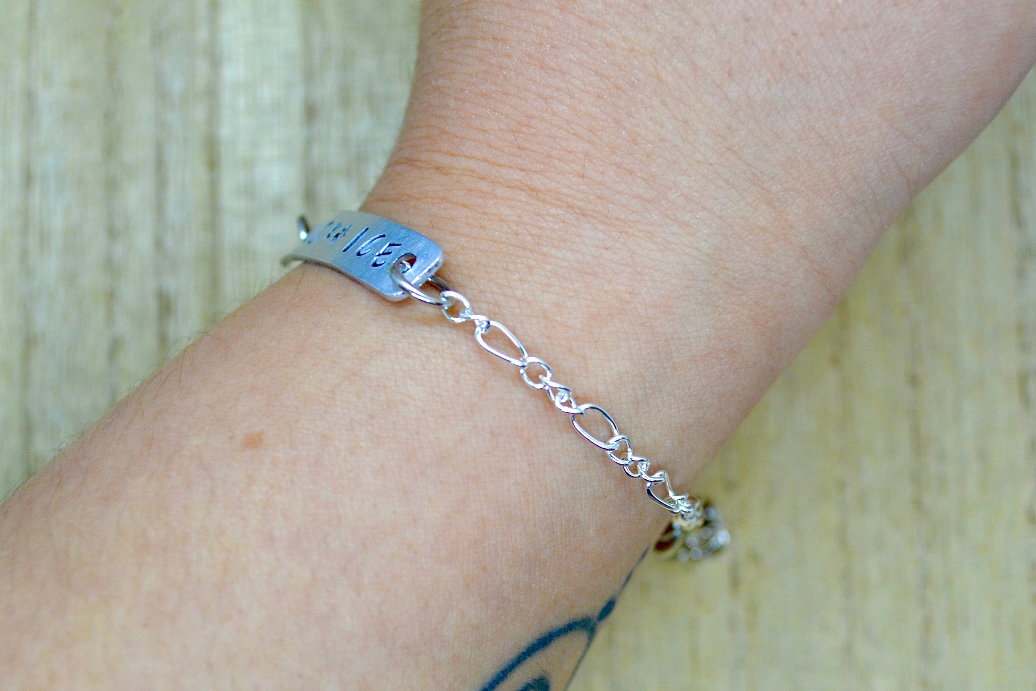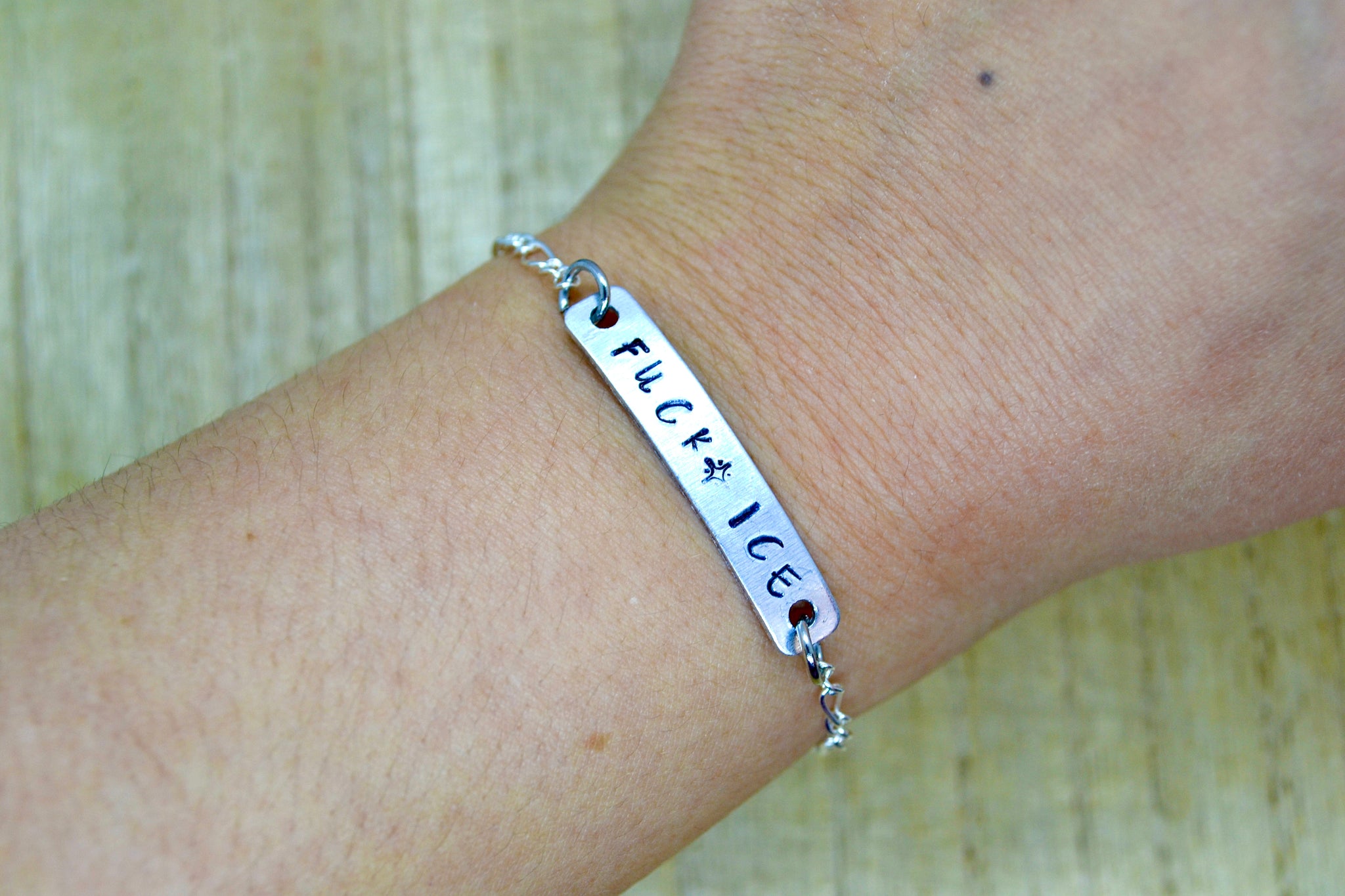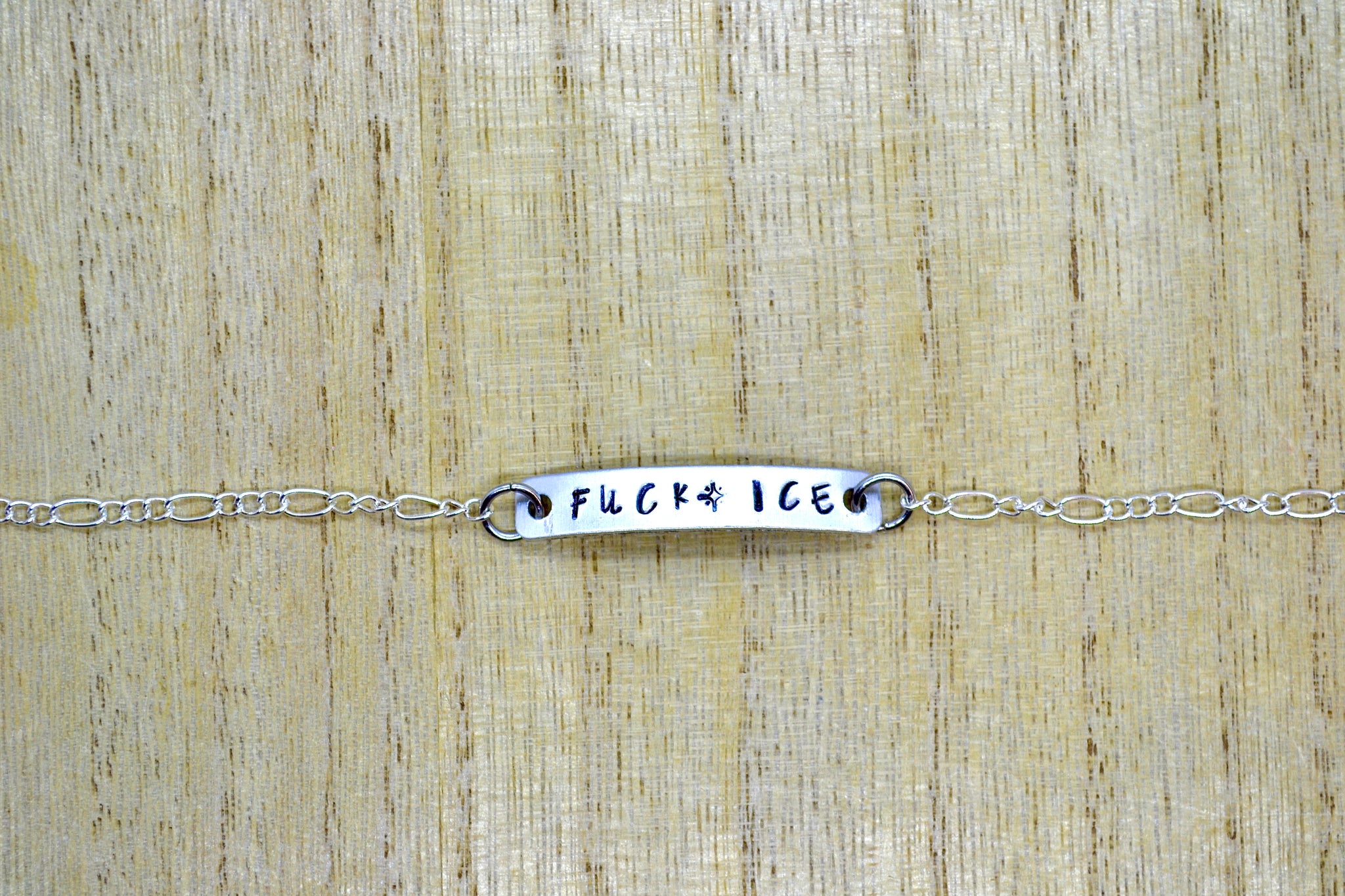 This adjustable aluminum and silver plated bracelets are hand stamped with “F*ck ICE”.