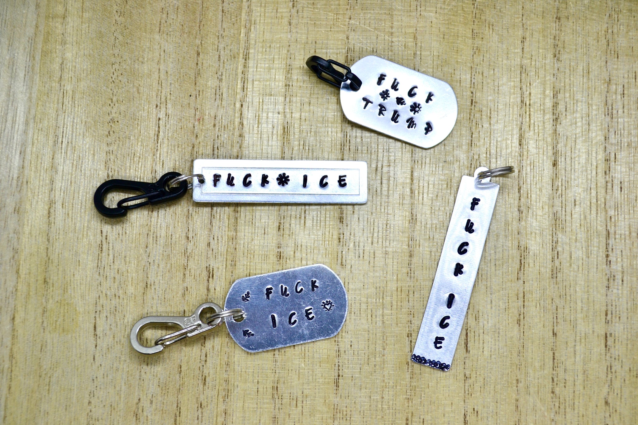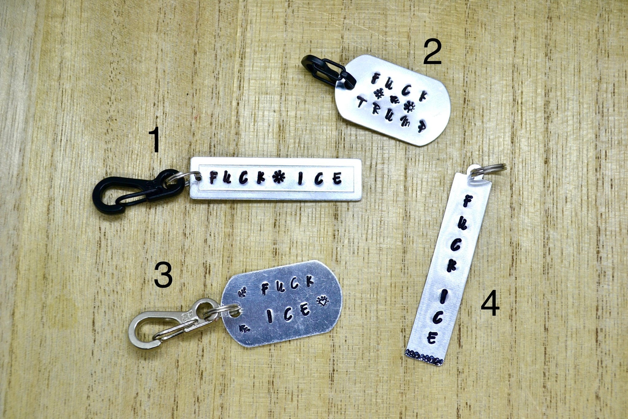 These hand-stamped keychains are now available in 4 designs, numbered accordingly.